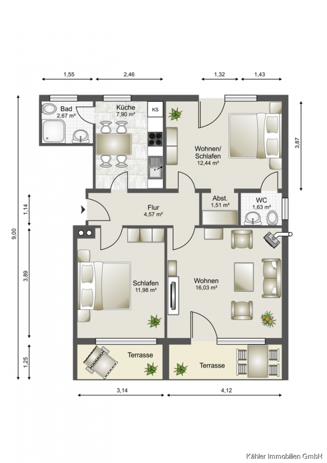 Über einen gemeinsamen Flur des Apartmenthauses erreichen Sie die Eingangstür der 3-Zimmer-Wohnung. Hier empfängt Sie ein Flur mit Platz für eine Garderobe und Zugang zu allen weiteren Räumen. Ein großes Schlafzimmer bietet ein eigenes, separates WC und einen Zugang zum ruhigen hinteren Garten. Ein weiteres geräumiges Schlafzimmer verfügt über genügend Platz für ein Doppelbett und einen Kleiderschrank. Die moderne, neue Küche verfügt über einen Essbereich. Von hier aus gelangen Sie in das Tageslichtduschbad. Das helle Wohnzimmer wurde im Jahr 2022 mit einem kleinen Holzofen ausgestattet, der den neuen GEG Bestimmungen entspricht und verfügt zudem über einen Zugang zu den Terrassen.