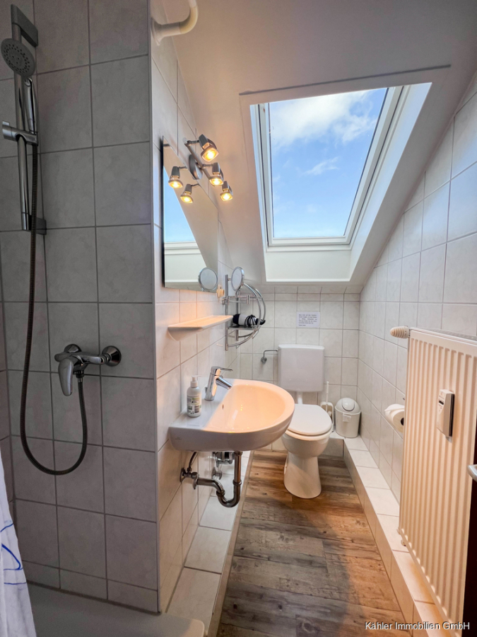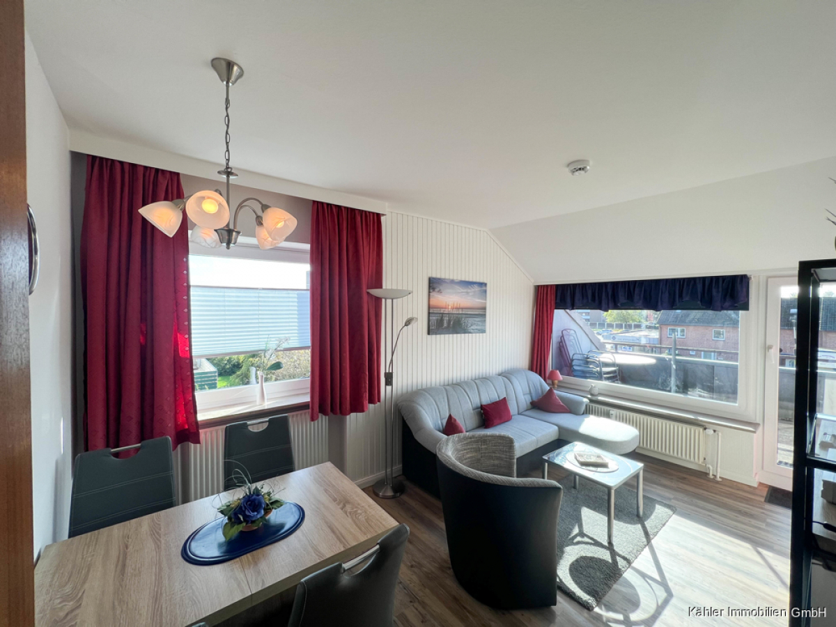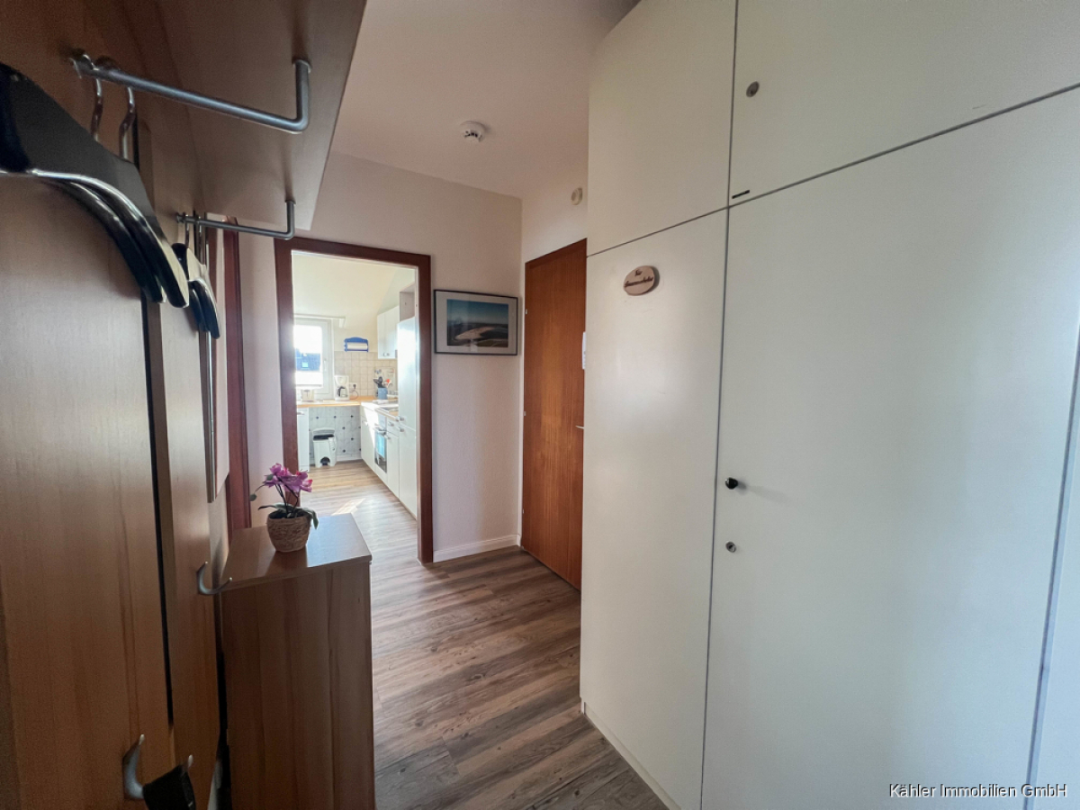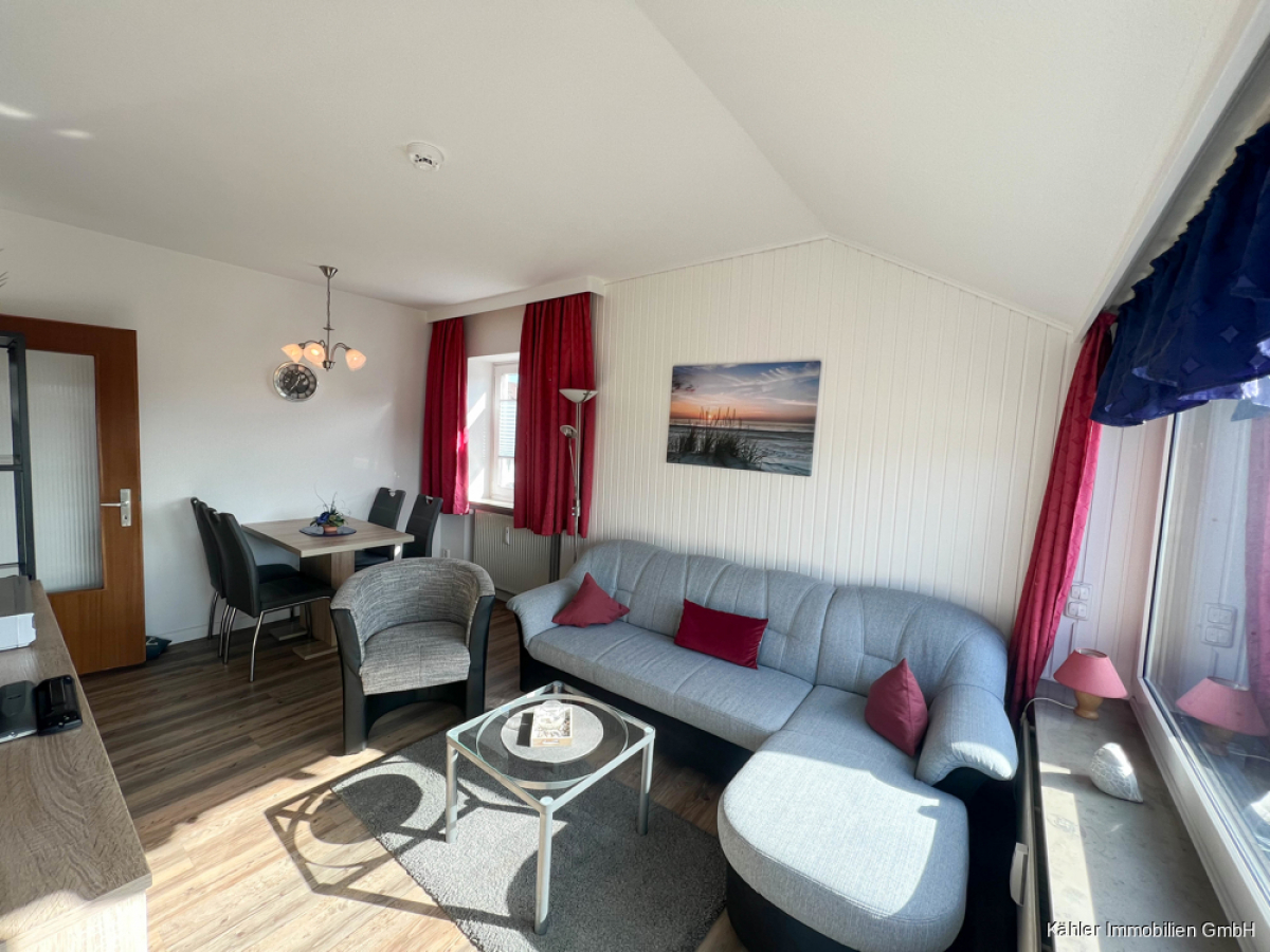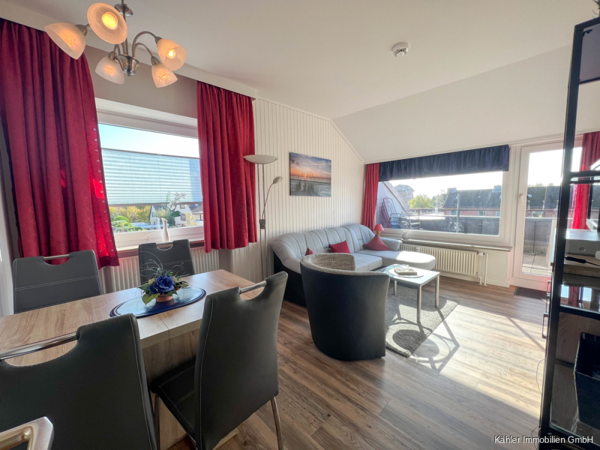 Diese zentral gelegene 2,5-Zimmer-Eigentumswohnung befindet sich im Dachgeschoss eines Apartmenthauses mit 16 Wohneinheiten und verfügt über ca. 49,69 m² Wohnfläche. Ein Lebensmittelgeschäft und ein Bäcker befinden sich direkt im Erdgeschoss des Apartmenthauses. Der Kurpark, der Grünstrand und die Familienlagune befinden sich ebenfalls in unmittelbarer Nähe. In ca. 10-15 Gehminuten erreichen Sie die beliebte Alleestraße mit diversen Cafés, Restaurants und Einkaufsmöglichkeiten. Ebenso das neu gestaltete Schwimmbad "Meerzeit" und den Museumshafen.