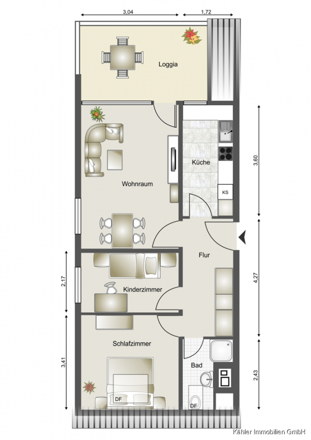 Die Wohnung bietet im Eingangsbereich einen geräumigen Flur mit Platz für einen großen Kleiderschrank. Das helle Wohnzimmer besitzt einen Ess-/Wohnbereich und einen Zugang zu dem großzügigen, sonnigen Südbalkon. Das Fenster und die Tür zum Balkon sind mit elektrischen Außenjalousien versehen. Des Weiteren verfügt die Wohnung über eine separate Küche, die mit sämtlichen Geräten ausgestattet ist und ein helles Tageslichtduschbad. Ein Schlafzimmer bietet ein Doppelbett und ein Dachflächenfenster mit einer elektrische Außenjalousie. Im zweiten Schlafzimmer befindet sich ein Etagenbett und ein klappbarer Tisch zum Malen und Basteln für Kinder.
