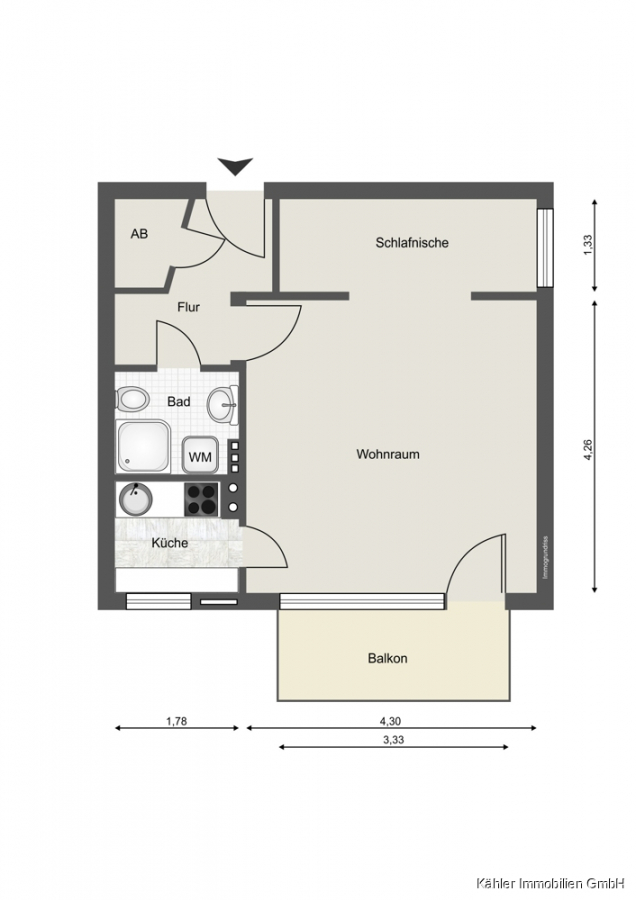 Auf insgesamt ca. 34,56 m² Wohnfläche bietet Ihnen die Wohnung ein helles Wohnzimmer, eine Schlafnische mit Platz für zwei Einzelbetten sowie ein Duschbad.