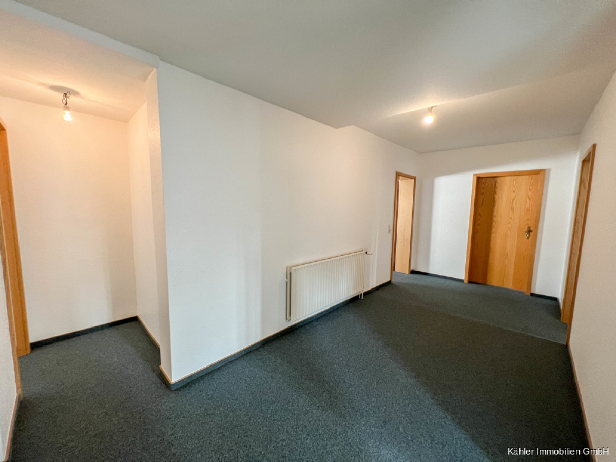 Über den Eingangsbereich im hinteren Teil des Gebäudes erreichen Sie das Treppenhaus, über welches Sie in das Obergeschoss gelangen. Dort empfängt Sie ein großzügig geschnittener Flur sowie eine Pantryküche.