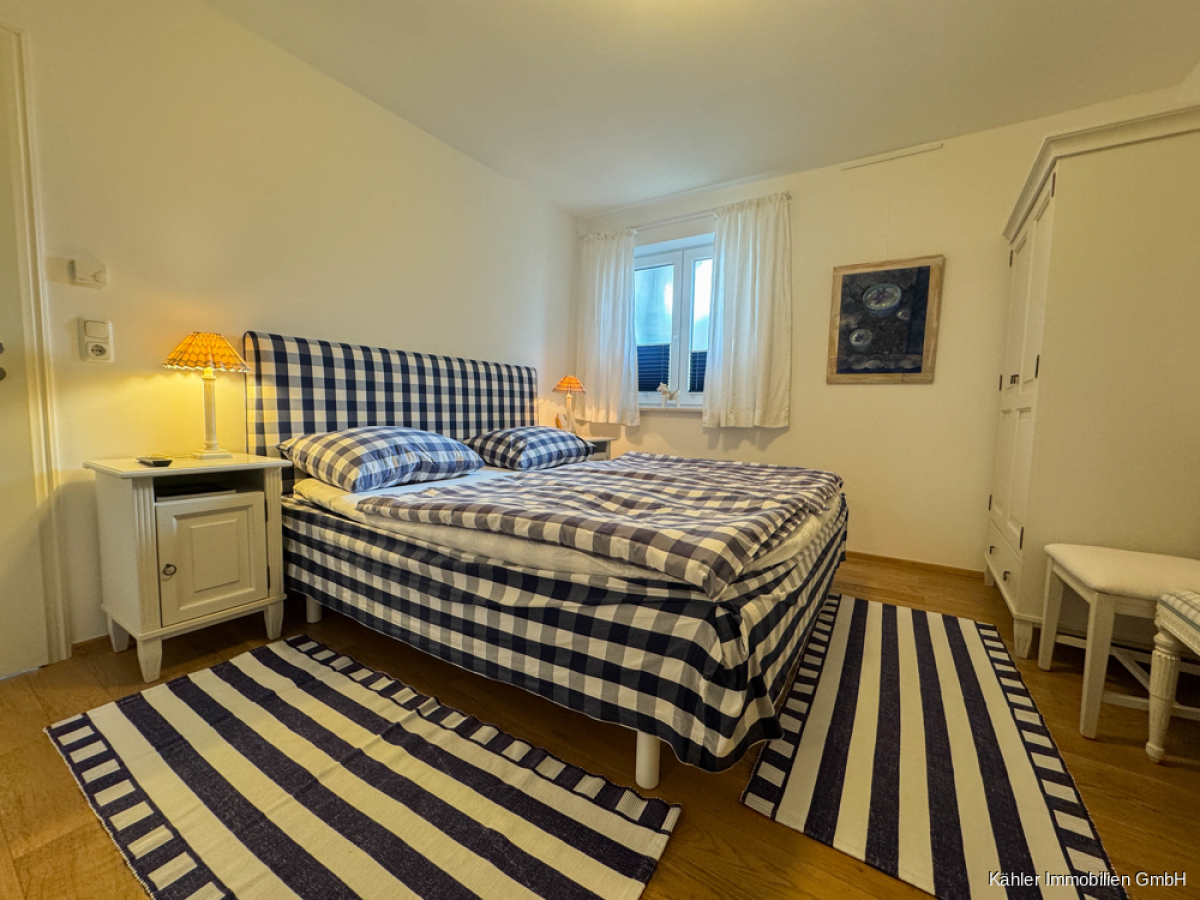 Das geräumige Schlafzimmer besticht besonders durch das Bett Marquis der schwedischen Bettmanufaktur Hästens. Hier befindet sich außerdem ein großer Kleiderschrank des schwedischen Möbelherstellers Englestroem, welcher zusätzlichen Stauraum bietet. In diesem Raum, sowie auch im Wohn- und Essbereich ist Echtholzfußboden in der Farbe Eiche hell verlegt.