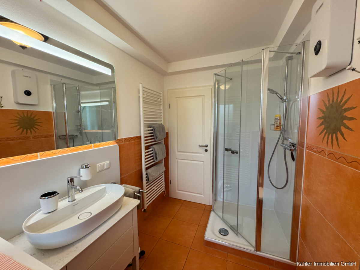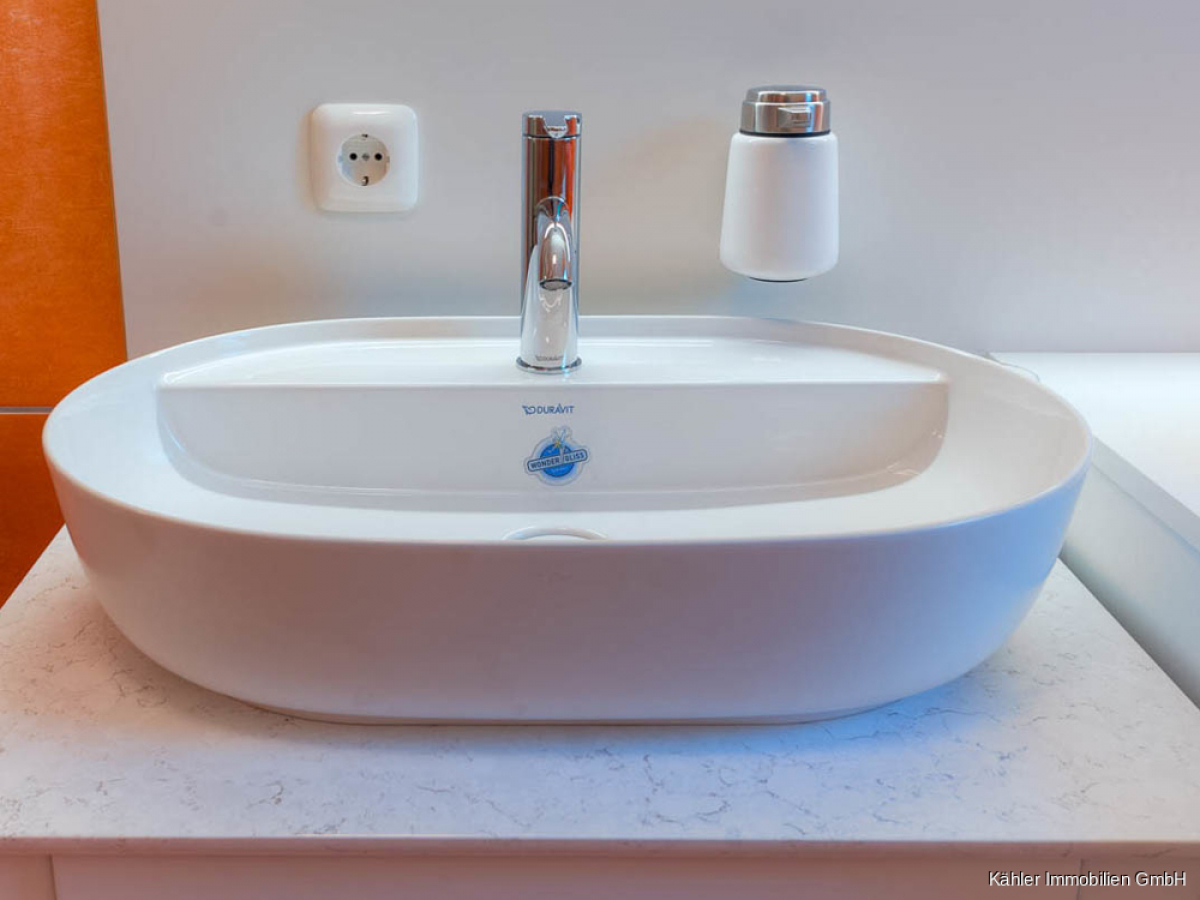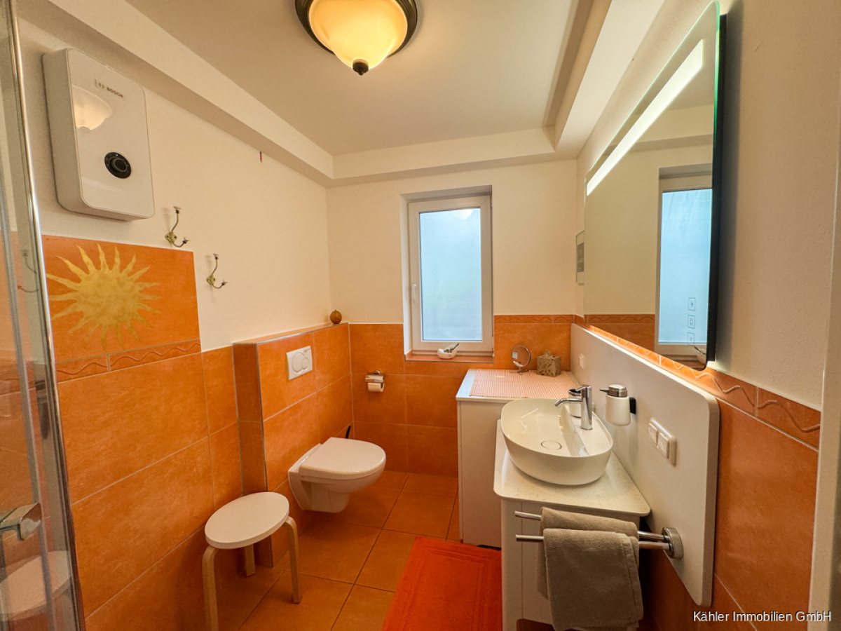 Das Badezimmer mit orangefarbenen Fliesen ist mit einer flachen Duschwanne, einem elektrischen Heizungstrockner und dem hochwertigen Duravit-Waschtisch der Designerin Cecilie Manz ausgestattet. Außerdem befindet sich hier ein Waschtrockner der Firma Miele.